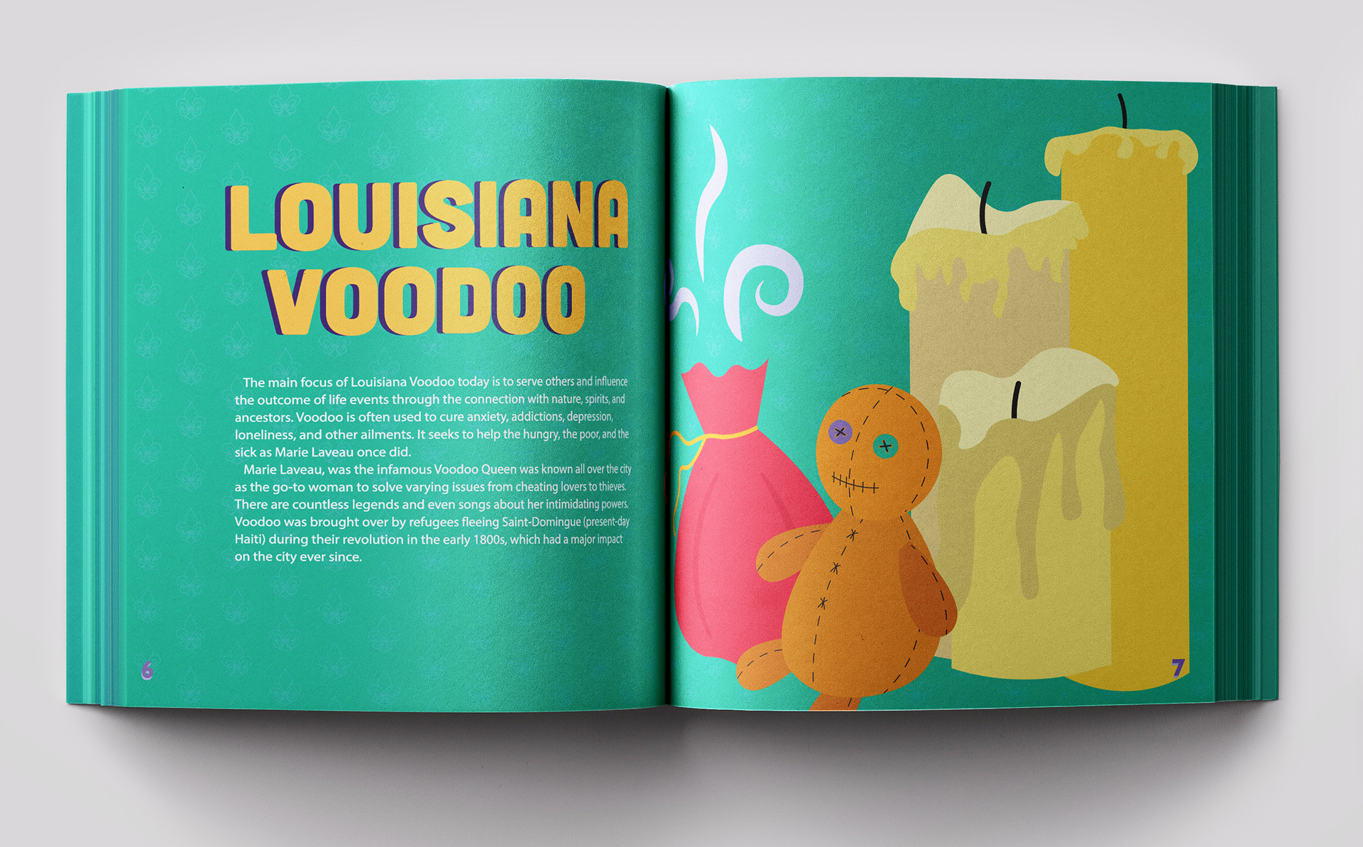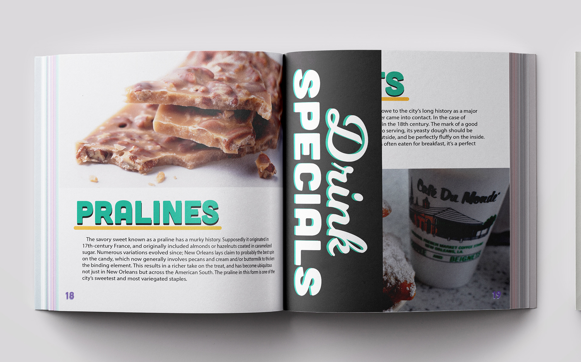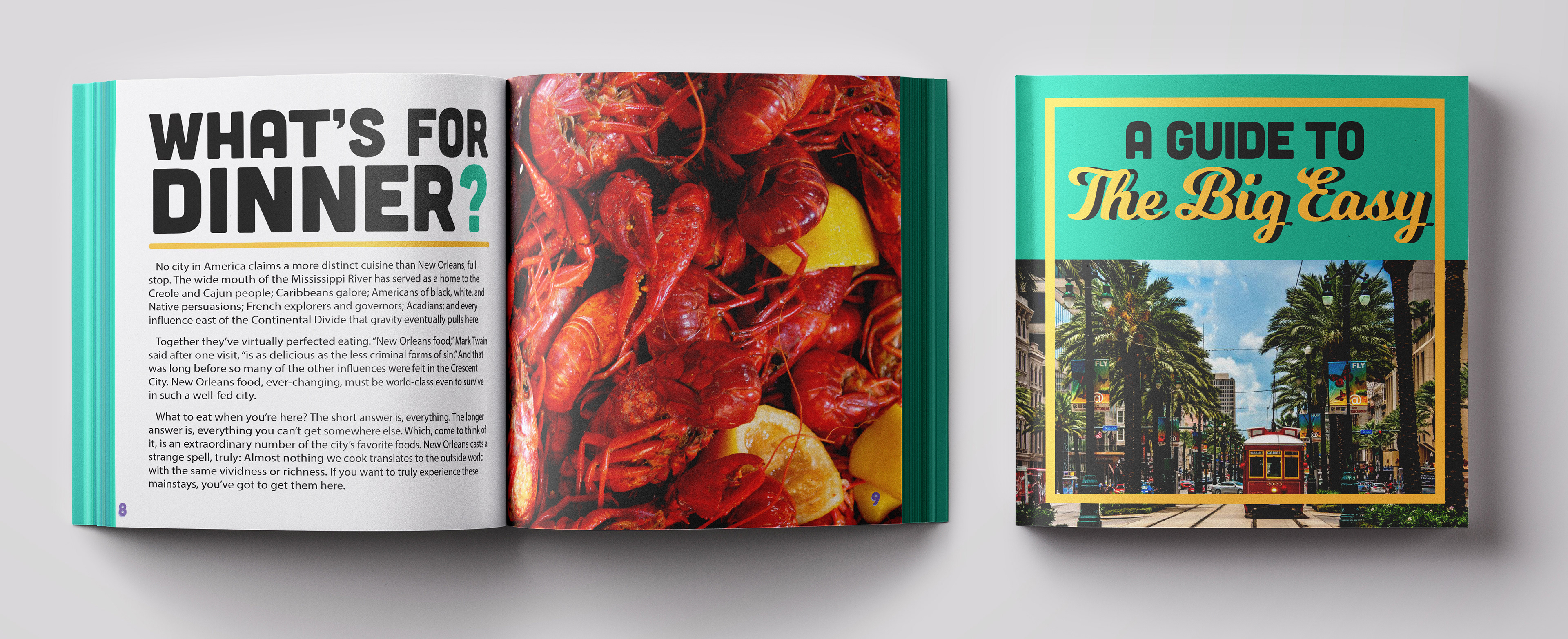 A mock guide to the big easy, features illustrated spreads and call out cards